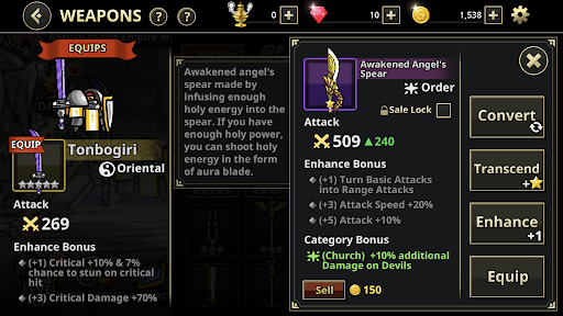 - Each weapon comes with a different enhancement bonus and skills. You can equip desired weapons.