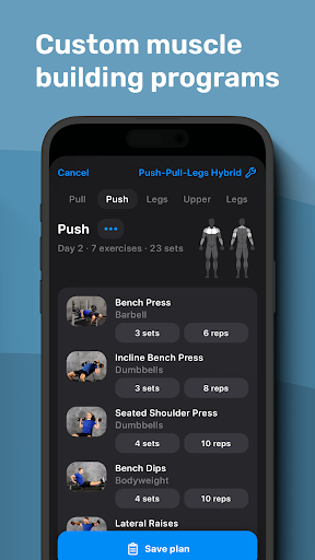 We celebrate your achievements by providing a list of personal records and milestones. That way, we ensure you're constantly inspired and rewarded for your hard work. For both men or women, our app creates personalized strength training plans to elevate your gym workout routine & muscle building journey. You can create your own plans for added customization.