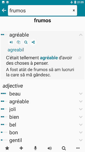 A quick French Romanian offline dictionary, alternative translation, frequently used sentences, tests (writing, listening, speaking) and games...