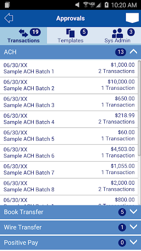• Approve ACH batches and templates, wire transfers, wire transfer templates, and repeat codes; book transfers, and book templates. You can also approve Positive Pay decisions.